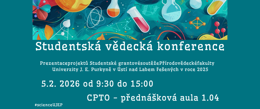 Ve čtvrtek 5. 2. 2026 od 9:30 se v přednáškové aule CPTO 1.04 uskuteční tradiční Studentská vědecká konference Přírodovědecké fakulty UJEP. Studenti doktorského a magisterského studia na ní představí projekty, které řešili v roce 2025 v rámci fakultní Studentské grantové soutěže UJEP.