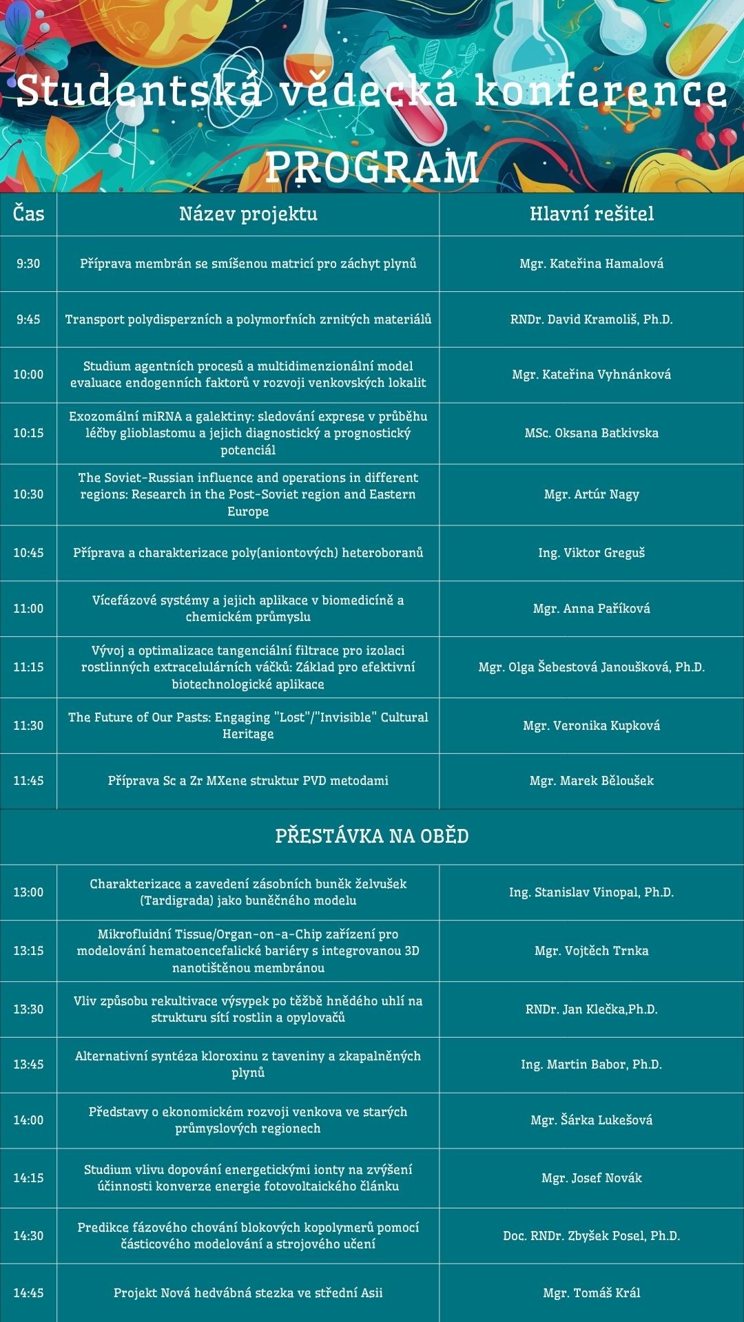 Letos Vás čeká bohatý program, na konferenci vystoupí 18 studentů a studentek a představí posluchačům zajímavá vědecká témata napříč všemi obory naší fakulty.